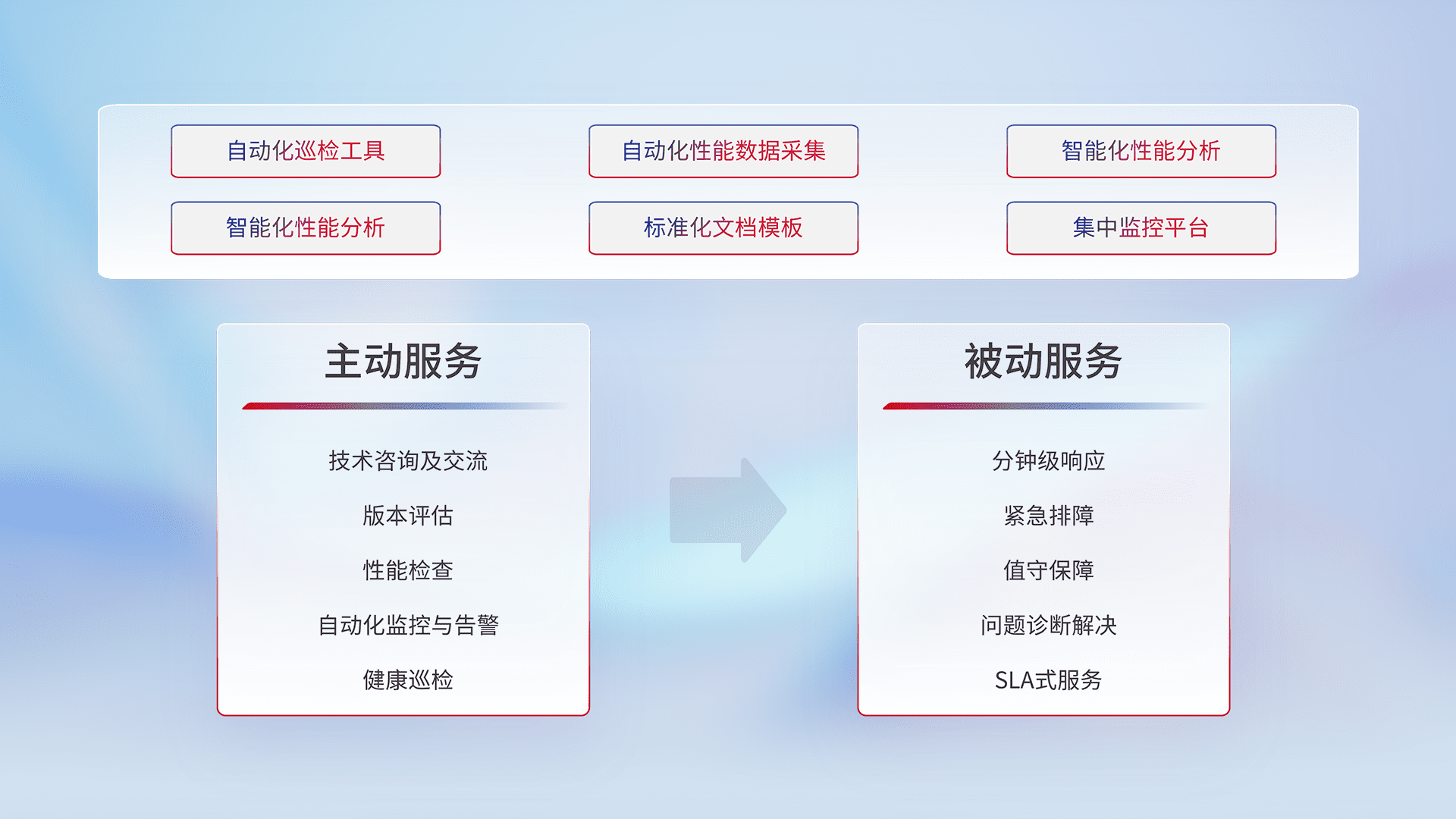 智能化工具和标准化文档,,,,保障服务质量,,,,提供主动服务(包含技术咨询、、版本评估、、、性能检查、、自动化监控与告警、、、健康巡检)和被动服务包含(分钟级响应、、、、紧急排障、、、值守保障、、、问题诊断解决、、、、SLA服务)。。