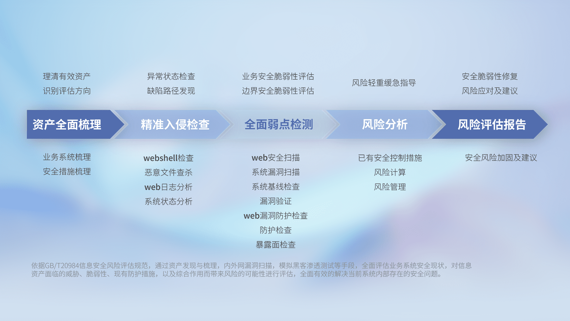 针对客户行业特性,,以专业的安全服务+多厂商联合解决方案提供专属的一站式安全管理服务,,,,帮助客户全面感知网络空间威胁,,,基于识别、、检测、、、、分析、、、、防护、、监测、、、、响应的服务理论模型,,,,从方案咨询、、集成交付、、、、评估验证、、、、优化加固、、运维运营,,,致力于为客户提供完整的闭环管理式安全服务。。。以实战经验为客户打造高抵御风险的安全体系,,帮助客户发现威胁、、对抗威胁、、、处置威胁,,,不断积累安全对抗能力,,,,持续保障数字化安全。。